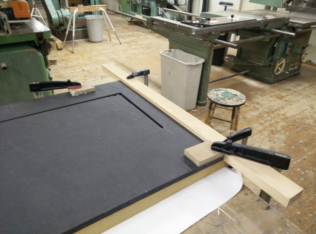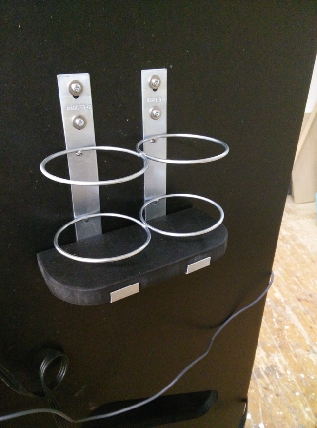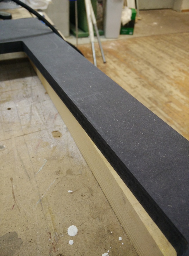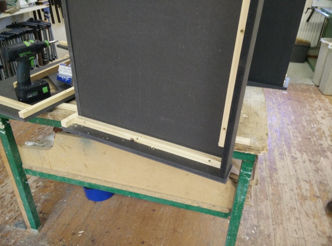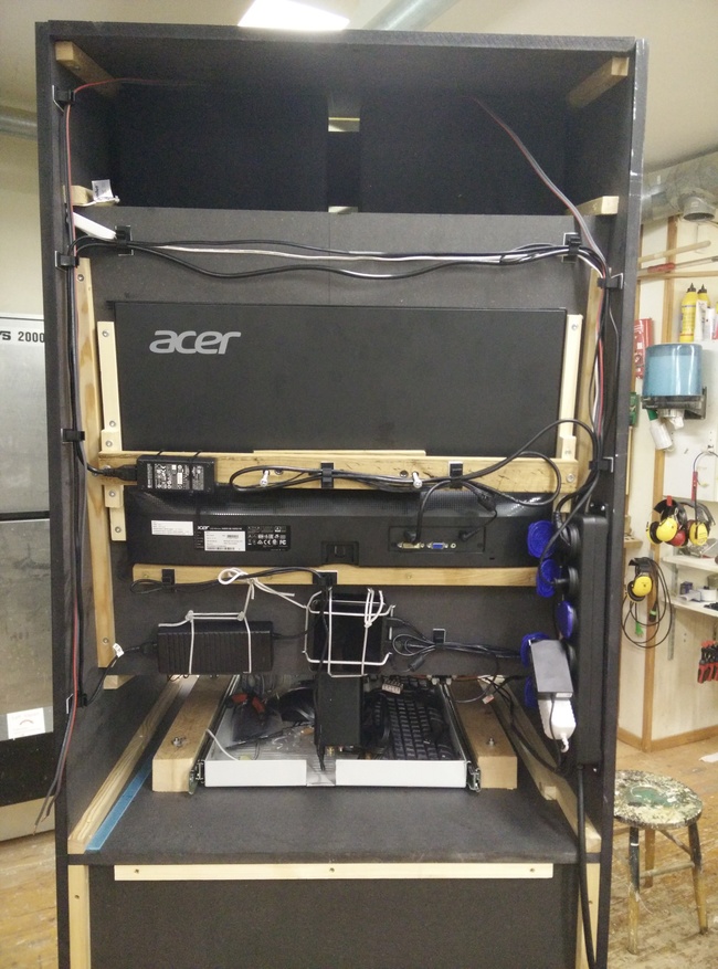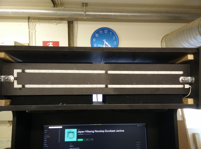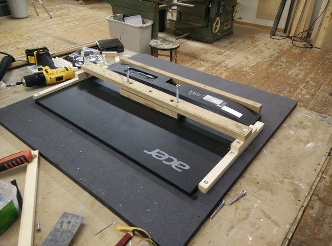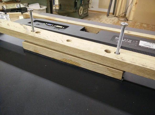 So I had to come up with something that would allow me to very gradually press it against the sealing profile between the bezel and the monitor, and ended up with a couple of screw-nuts hammered into the horizontal bar.
